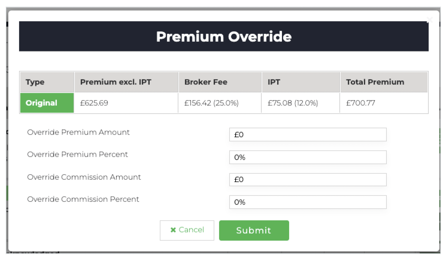 If the broker wants to change the override amount again, they can re-open the Premium Override pop-up by clicking on the “Premium Override” button again.