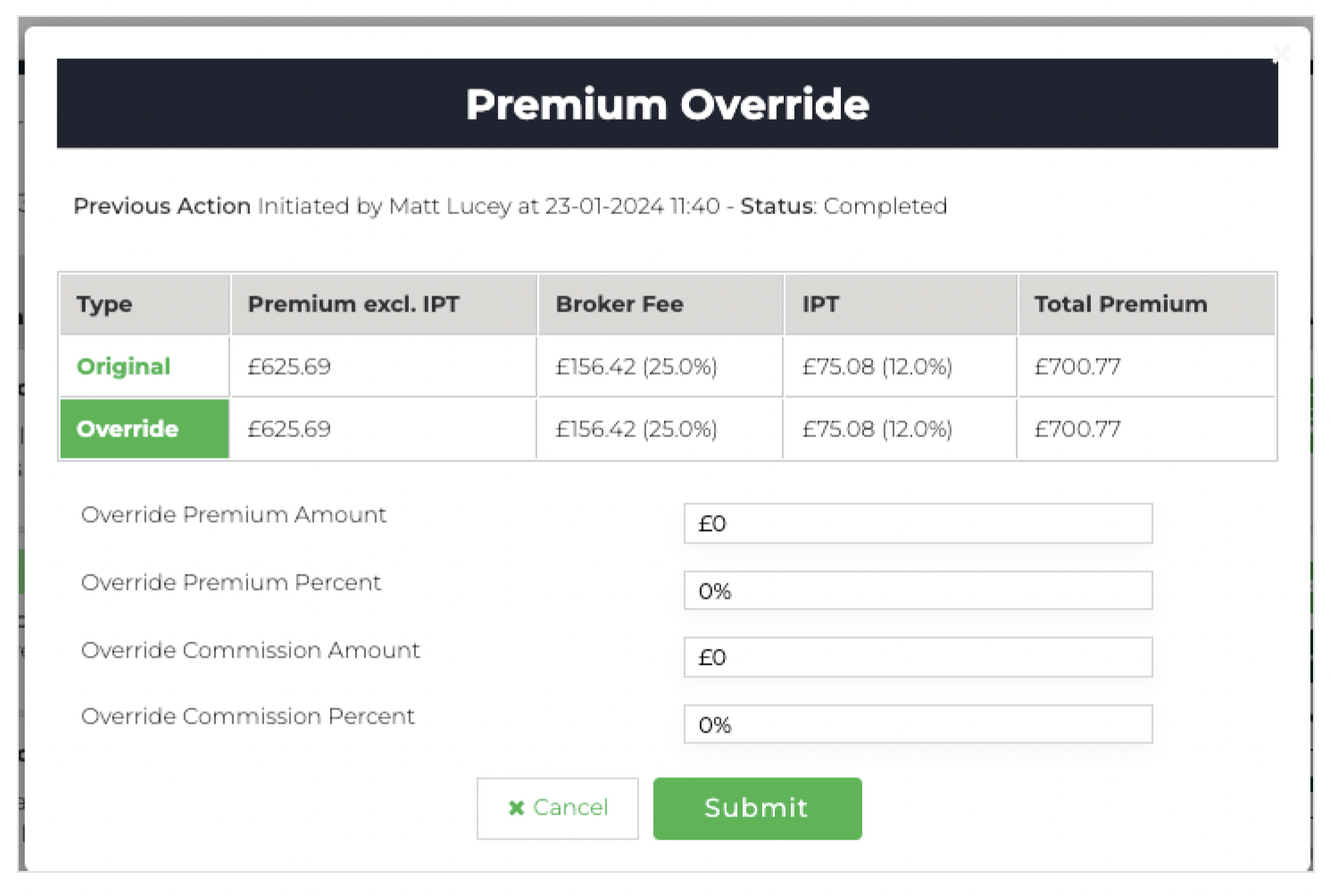When re-opened, the pop-up will display both the original premium returned by the insurer and the current premium as set by the most recent override.