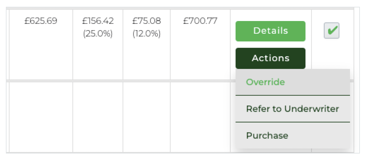 If a request has resulted in a Quoted response, the broker may be presented with a “Premium Override” button under the Actions dropdown.